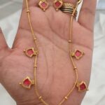 Add a touch of timeless elegance to your ethnic collection with this beautifully crafted antique finish necklace set. Designed with a delicate chain and traditional pendant motifs, the set features rich red stone detailing that enhances its classic appeal. Paired with matching earrings, this lightweight jewelry set is perfect for daily ethnic wear, festive occasions, poojas, and family functions.