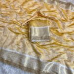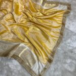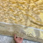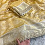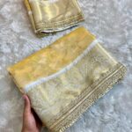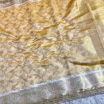 This Golden Ivory Heritage Banarasi Saree is a quiet celebration of tradition and craftsmanship. Woven in a soft ivory-golden base, the saree features intricate floral zari motifs that flow gracefully across the fabric. The richly detailed border, finished with delicate pearl lace work, adds a touch of regal charm and refined luxury.